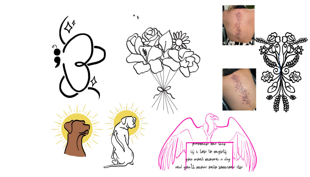 Ellie: She asked for a semicolon butterfly. A semi colon tattoo represents a story that didn’t end. The semicolon is most commonly associated with being a suicide survivor. The butterfly represents flourishing after such a major event. Shw ants this on her wrist or behind her ear.