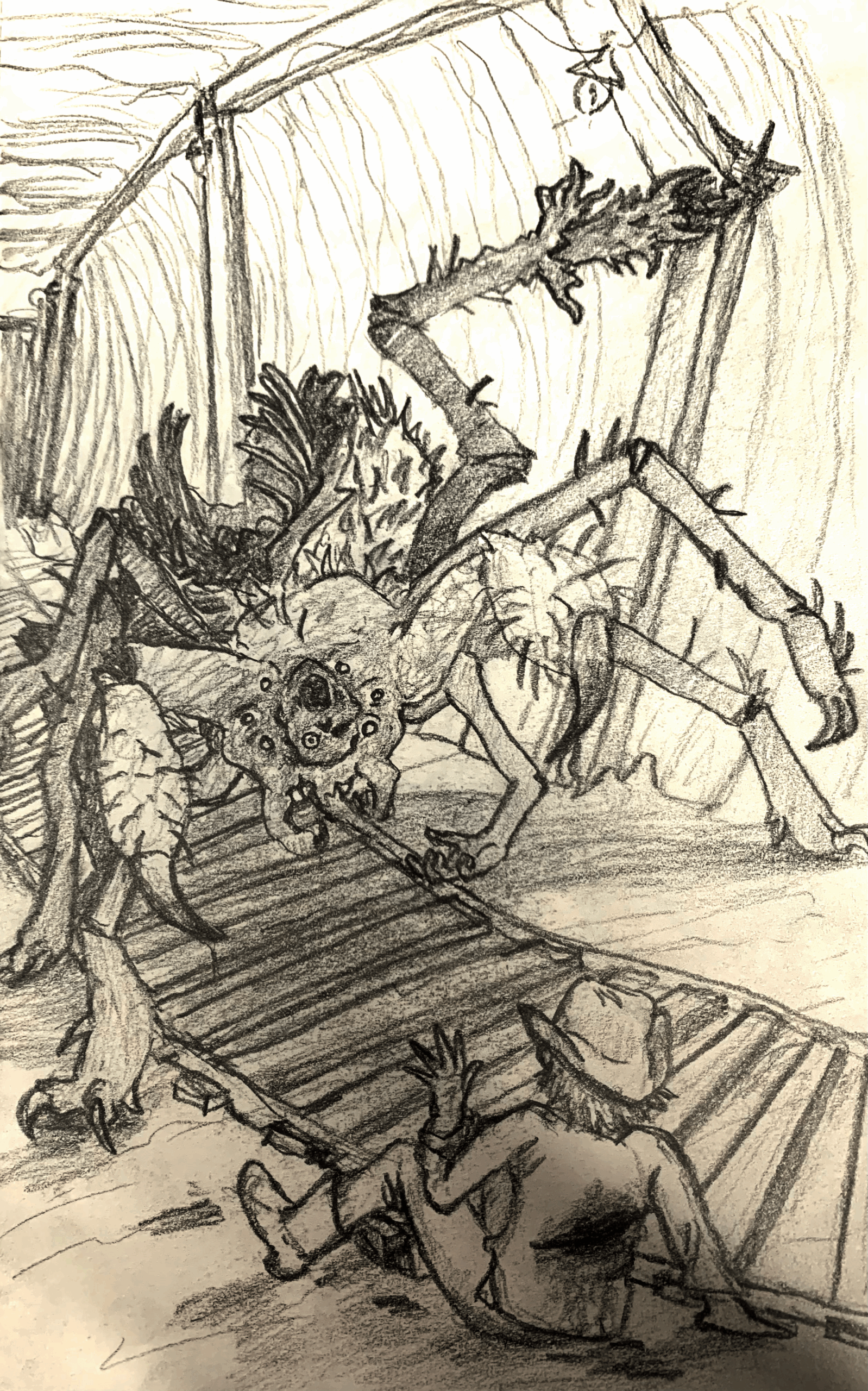 Here is a traditional sketch of a wounded character struggling to escape a monstrous spider mutant down an abandoned mine shaft. This scene is inspired from a video game I love to play called Hunt Showdown.