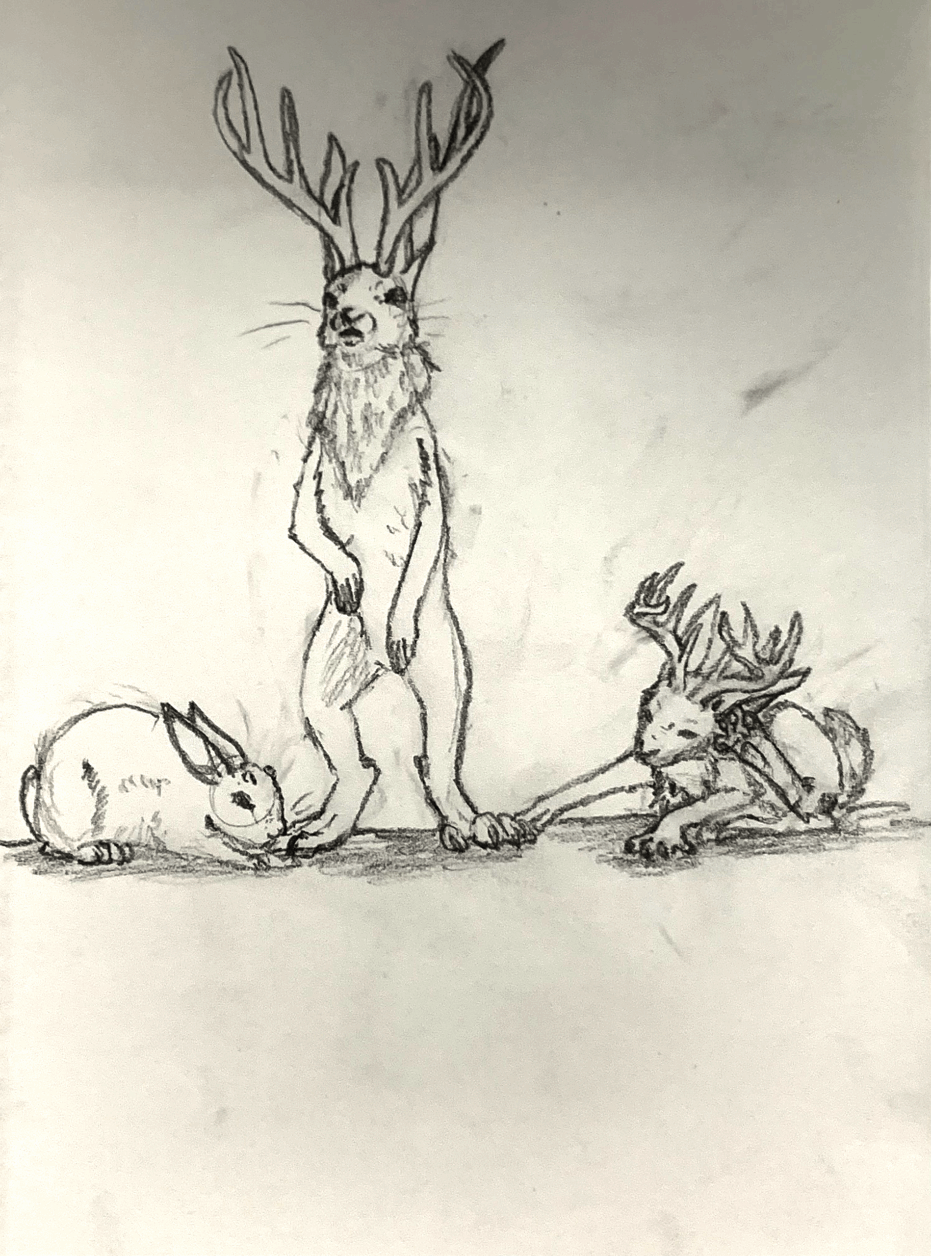 Below is group concept of the cryptic creature: the jackalope. I was experimenting with different poses I could draw the creatures in and how I would need to angle the antlers a specific way to make them look natural. Traditional sketch.