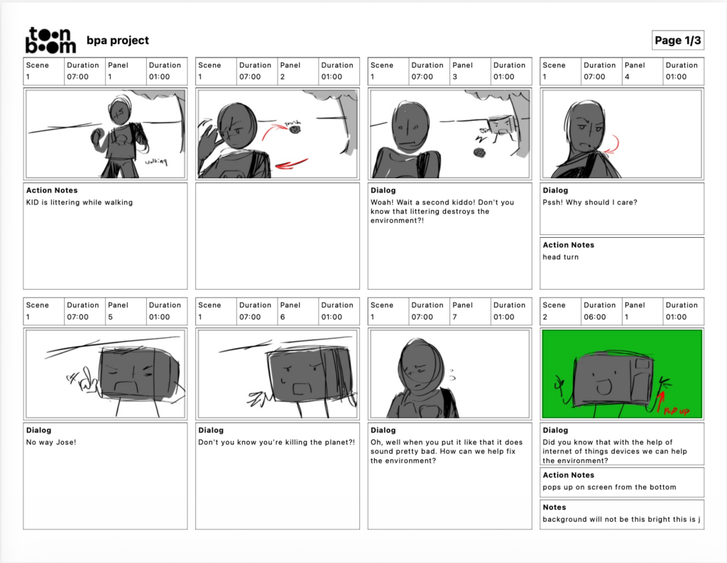 For this project I was tasked with directing a animation not exceeding 2:30 minuts about the helpfulness of IoT (Internet of things) devises in helping the environment. We decided to tell the story of a little kid being taught the lesson by a sentient microwave computer named Wavie. My biggest challenge for this project was communication I often struggled to communicate my ideas with my team which lead to confusion later on in the process.