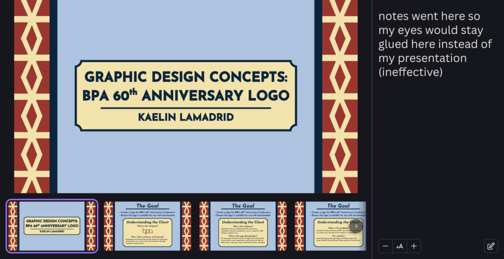 I also included links to BPA’s branding guidelines, which was a great source for picking colors and finding the exact font that BPA uses with their branding. I also included links to some BPA logos and such that my teacher has access to so that I could pull an exact logo rather than lettering my own.