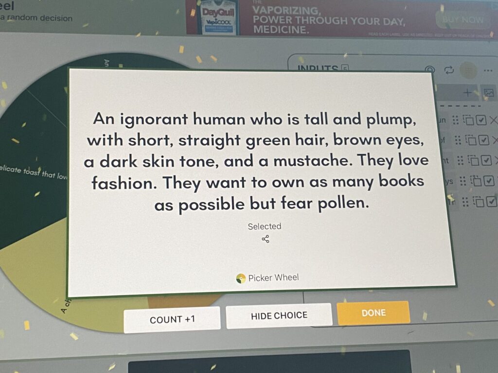 Firstly, I wanted to pick the character that I was going to be designing. When looking at my prompt options, I decided to go a different approach and let the wheel of fate make the decisions for me.