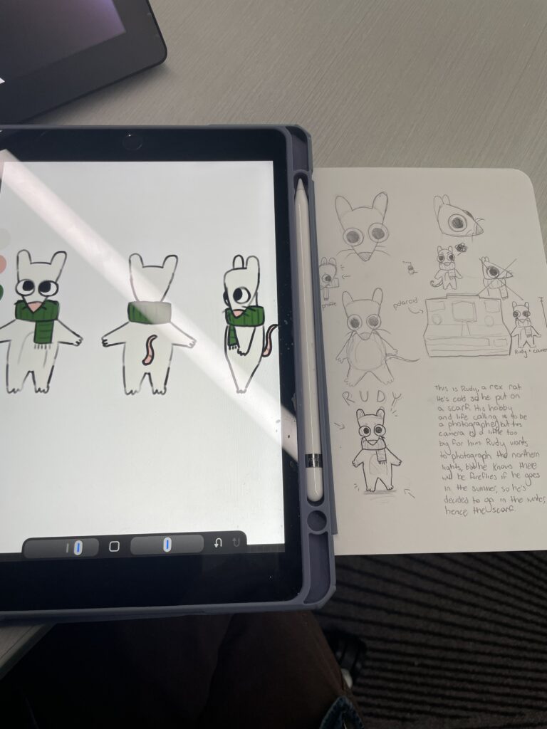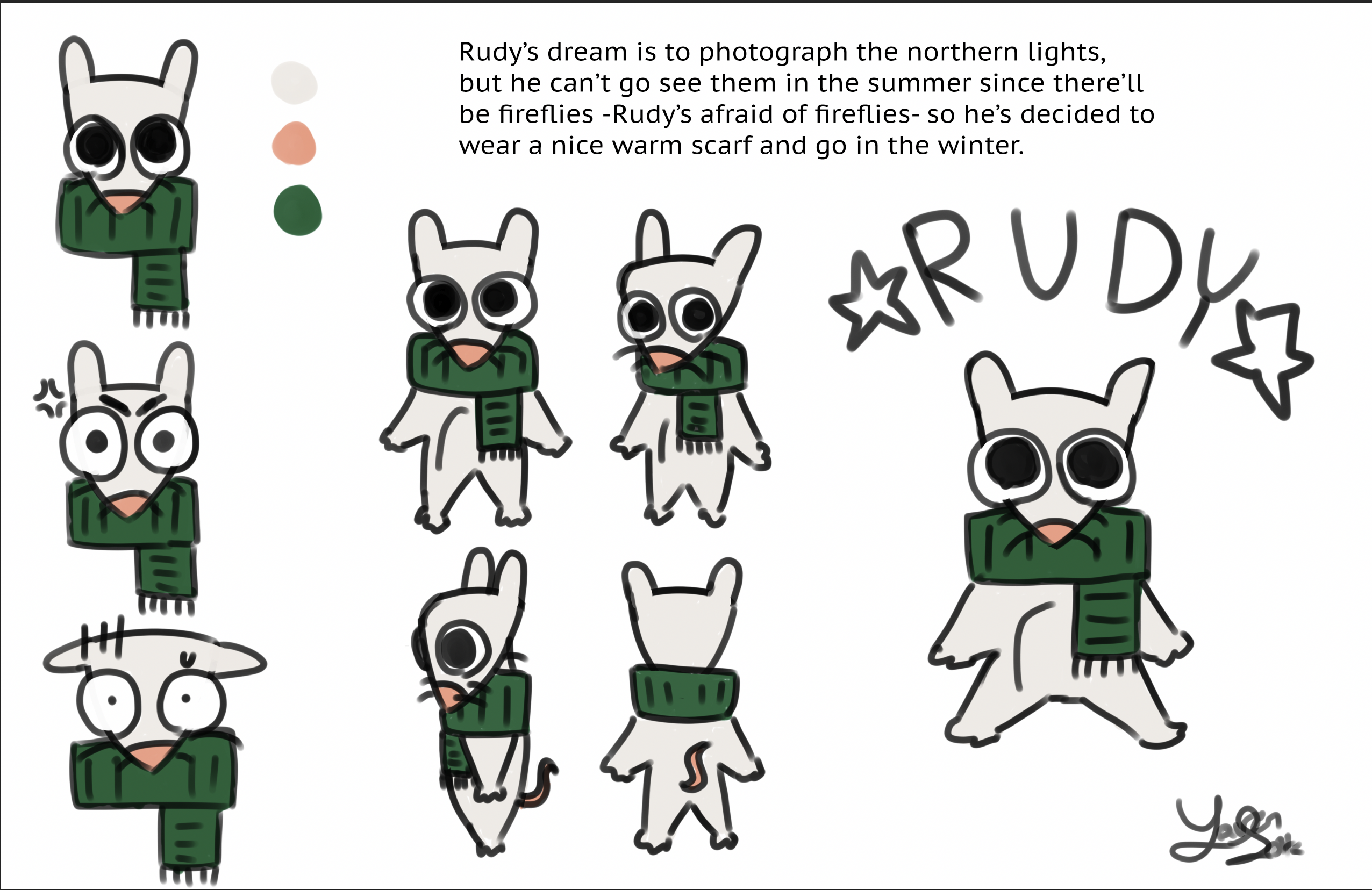 I started with making concept art: sketching Rudy's form and eventually adding his scarf. Then I recreated Rudy in photoshop, added color, and then went about creating the different sketches.