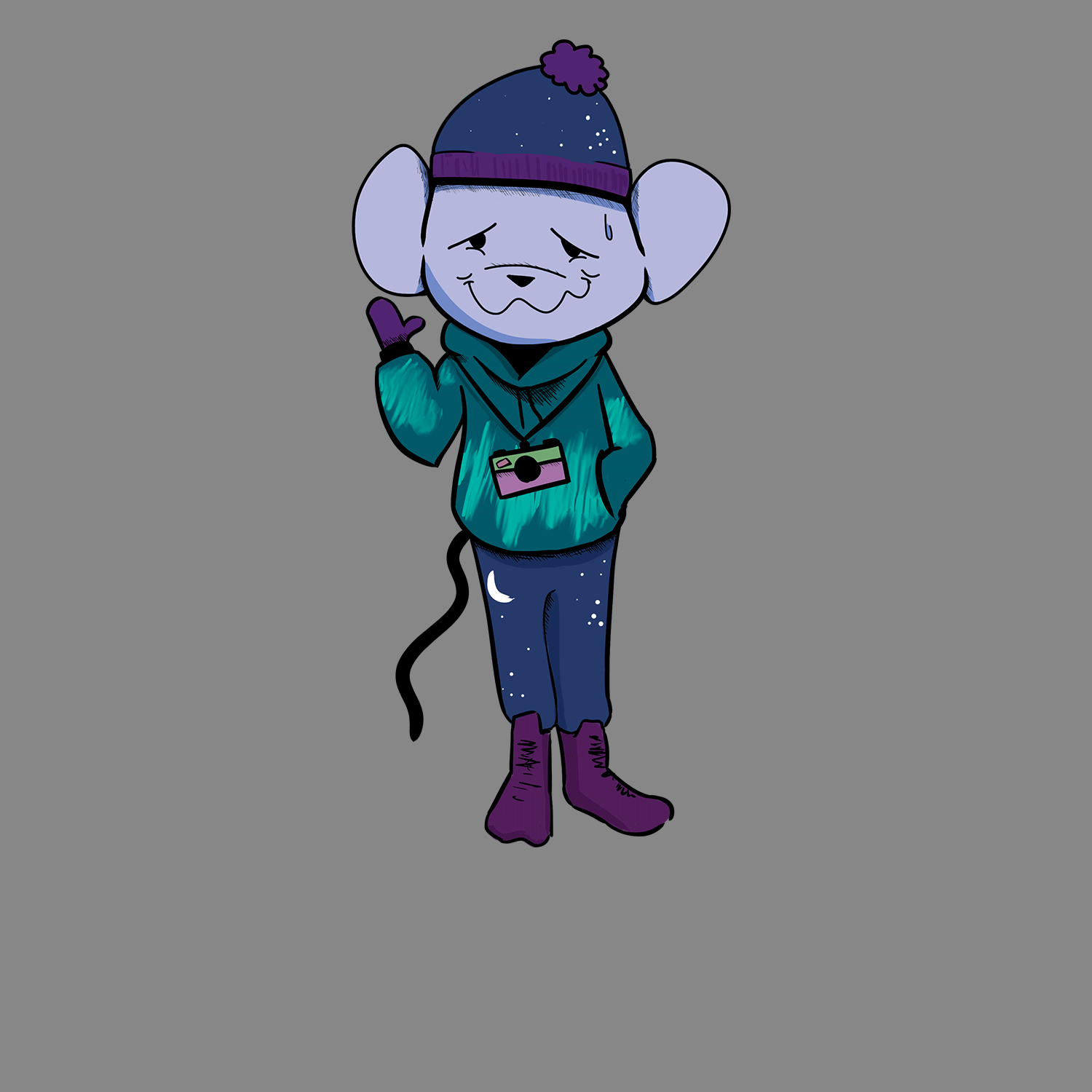 The project goal was to create a cold rat who loves taking pictures. The target audience was tweens/kids. In this project, I wanted to design the character so his personality was visible right away. That meant designing a strong silhouette and creating a clear, expressive face. Additionally, the character’s clothes are both fluffy and colorized to match the northern lights to emphasize some of his traits through some more subtle, but noticeable details.