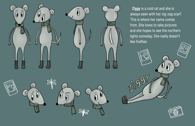 This was my skills showcase project, My prompt was to make a cold rat that loves taking pictures and hates fireflies. He also hopes to see the Northern Lights someday. I made my character Ziggy and she wears a zig zag scarf to keep warmth aswell as boots. I added tiny photos since she likes taking photos.