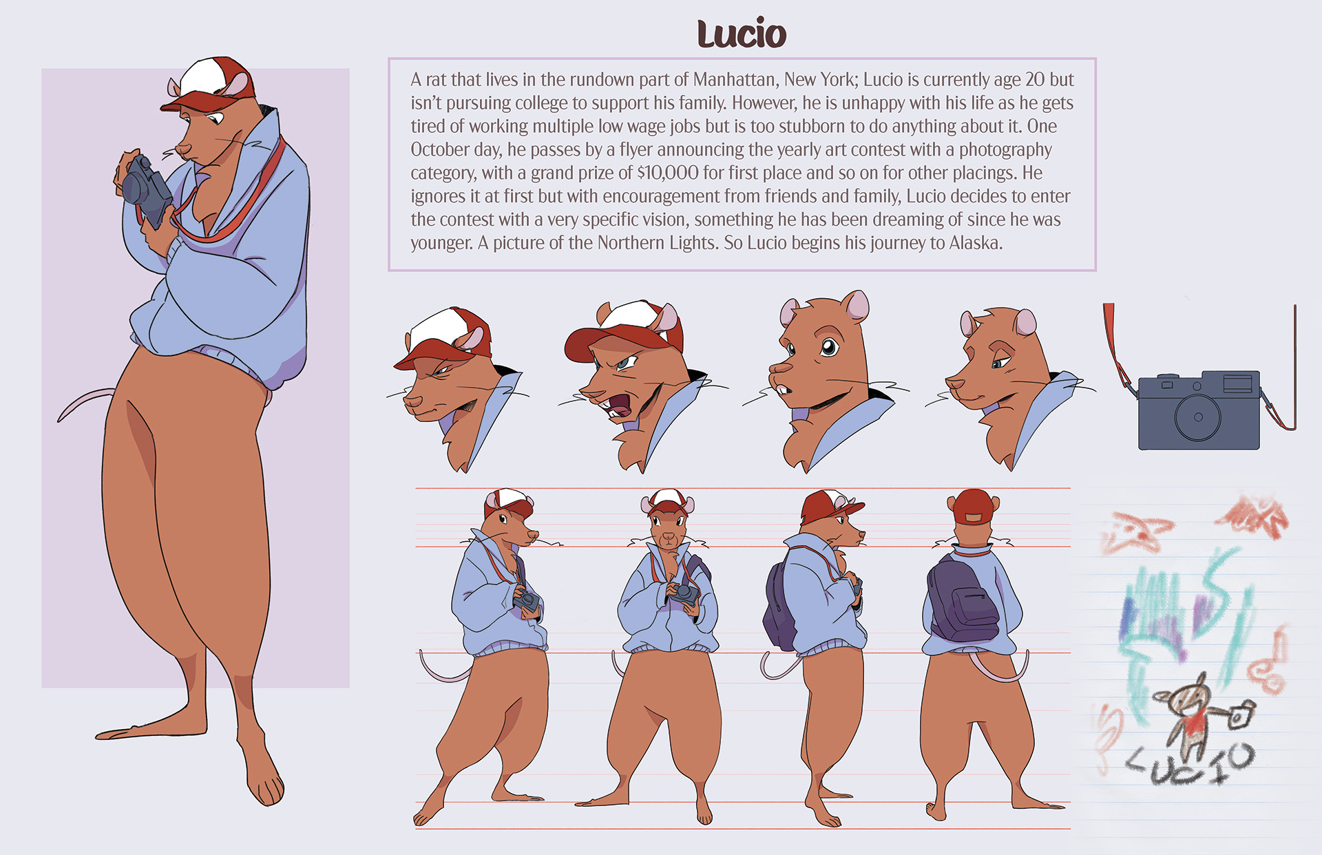 I think some of the best characters are ones that reflect their story. I went into this project knowing I wanted to tell a story with the character. That’s when I read the prompt of a cold rat that likes taking pictures and wants to see the Northern Lights and I immediately thought, “I could tell a story about poverty.”